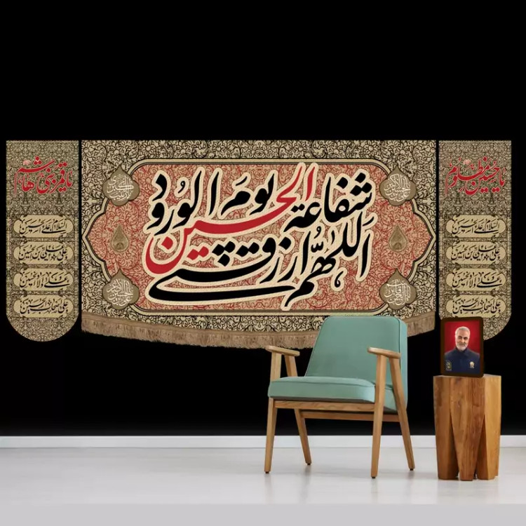 این کتیبه دیواری سه تکه می باشد و دو طرف با ذکر یا حسین مظلوم و یا قمر بنی هاشم با ابعاد 50 در 140 با ریشه دوزی پایین کار و تکه وسط 140 در 250 با ریشه دوزی پایین کار می باشد